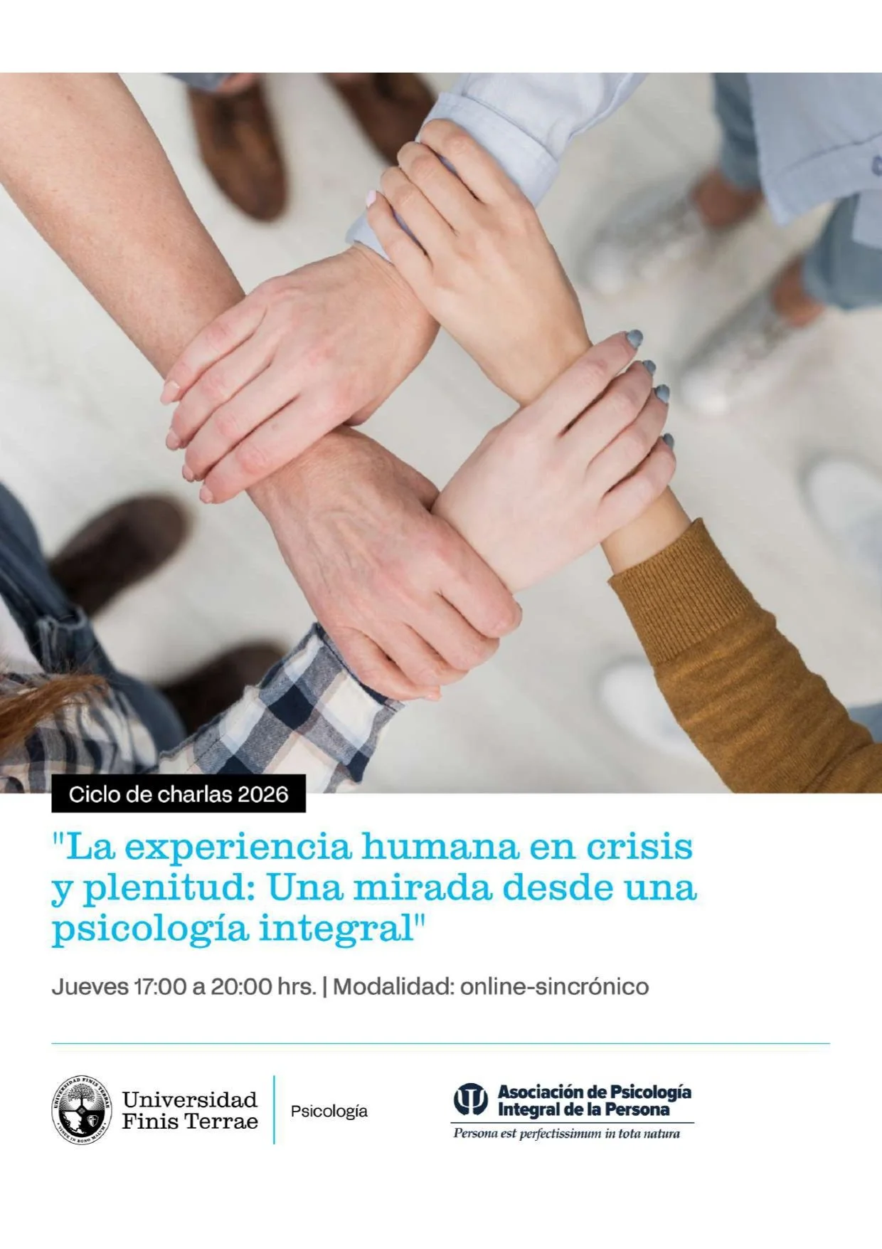 La Asociación de Psicología Integral de la Persona, en conjunto con la Escuela de Psicología de la Universidad Finis Terrae, le invita a participar en el ciclo de charlas “La experiencia humana en crisis y plenitud: una mirada desde una psicología integral”, un espacio de reflexión orientado a comprender algunos de los padecimientos psicológicos más frecuentes de la experiencia humana contemporánea.